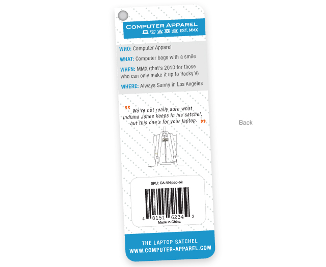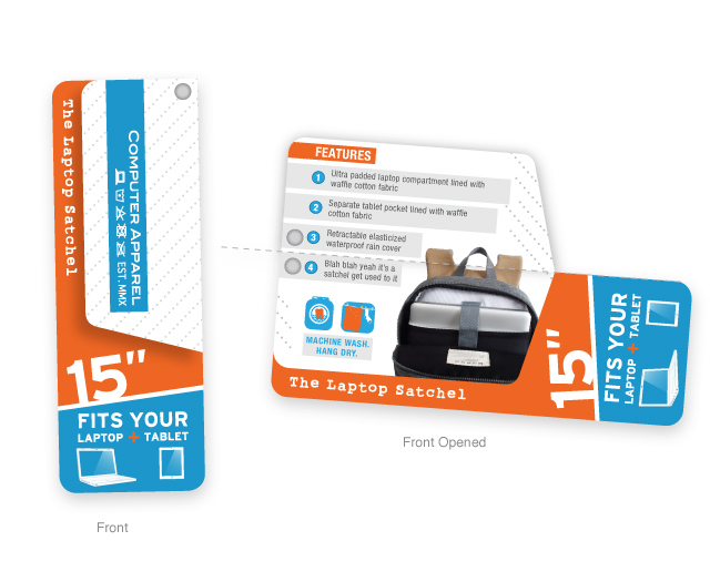 02. Laptop Satchel hang tag (front). -